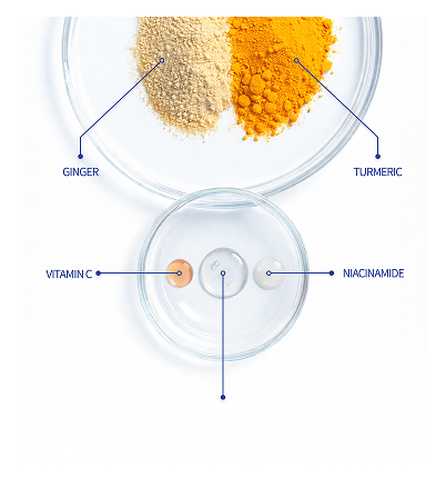A thoughtful fusion of turmeric’s time-honored wisdom, ginger’s calming clarity, and the precision of niacinamide and vitamin C.